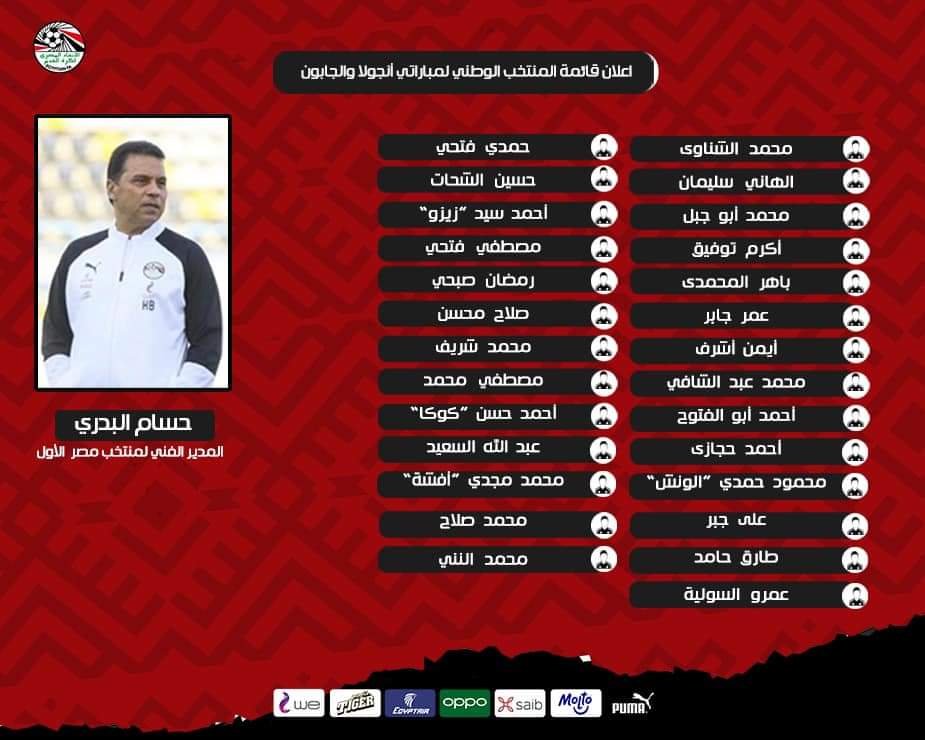 أعلن الجهاز الفني للمنتخب الوطني الأول لكرة القدم بقيادة حسام البدري قائمة اللاعبين النهائية المقرر انضمامهم لمعسكر المنتخب المقبل ،استعدادًا لمواجهتي انجولا والجابون يومي ١و٥سبتمبر المقبل في منافسات الجولتين الأولى والثانية للتصفيات الأفريقية المؤهلة لكأس العالم بقطر.