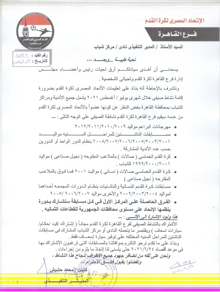 وأرسلت منطقة القاهرة خطابات للأندية ومراكز الشباب التاعة للفرع بتفاصيل النشاط الرياضي بعد إعتماد من محمد حشيش المدير التنفيذي لمنطقة القاهرة وأيمن حسان مدير إدارة المسابقات بالمنطقة .