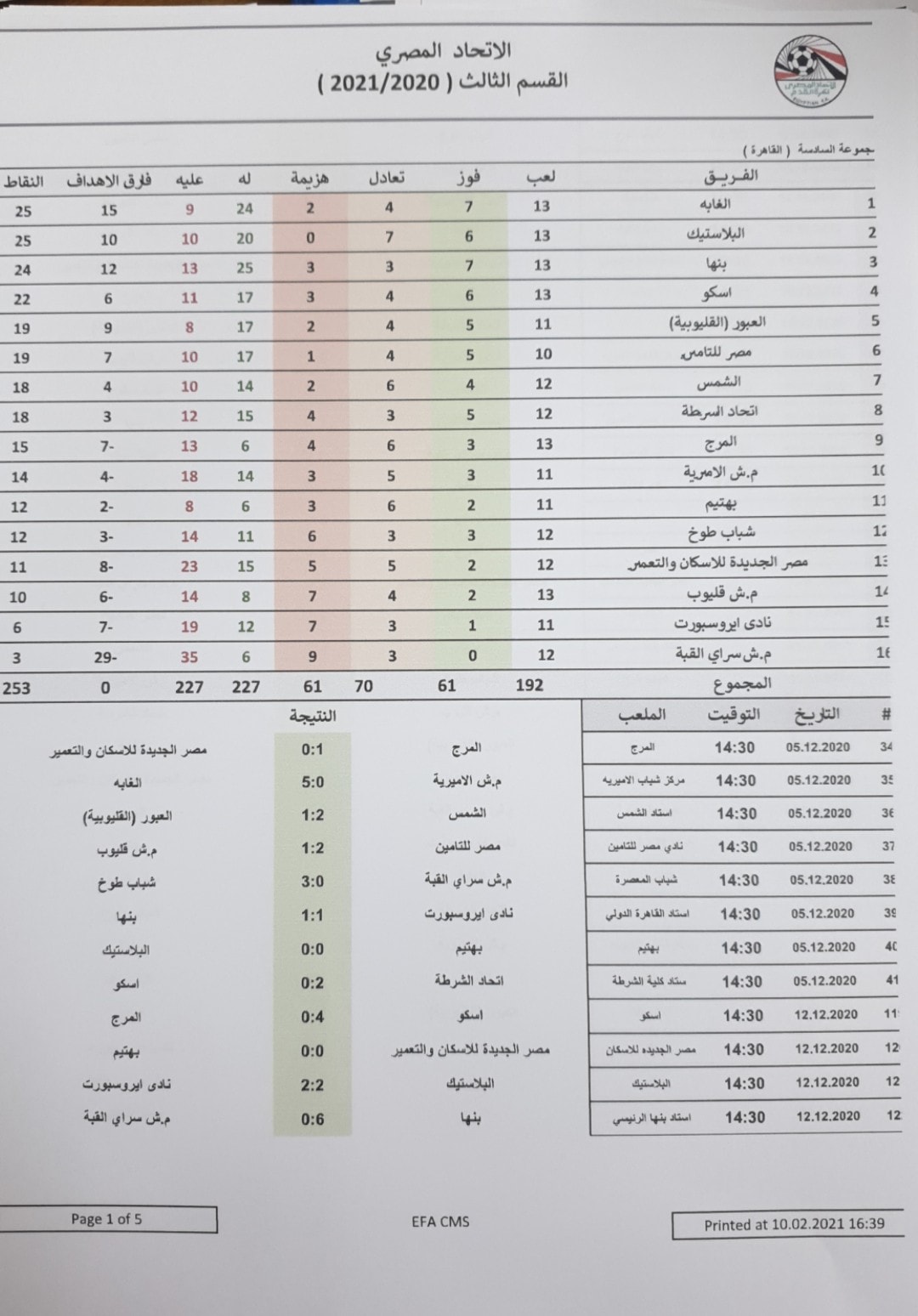 وأعتمد عبده عبدالعظيم رئيس لجنة مسابقات القسم الثالث وإيهاب توفيق مقرر لجنة المسابقات جدول الترتيب .