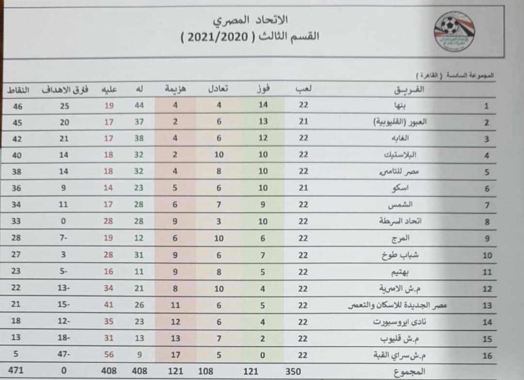 أعلنت منطقة القاهرة لكرة القدم برئاسة حمادة الشربيني ، جدول ترتيب المجموعة السادسة لدوري القسم الثالث  بعد مباريات الإسبوع ال 22 لدورى القسم الثالث .