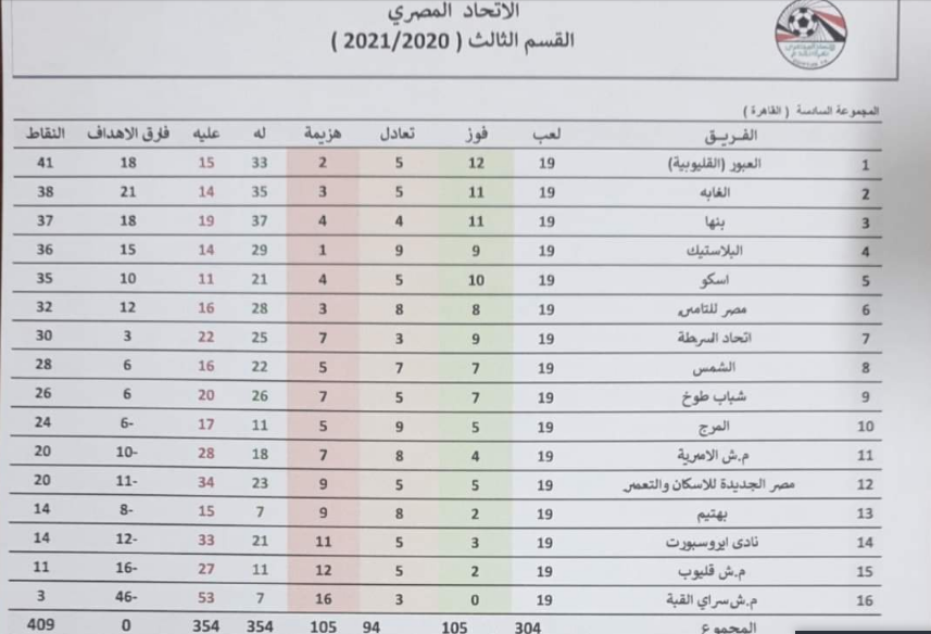 أعتمدت منطقة القاهرة لكرة القدم، برئاسة حمادة الشربيني، رئيس مجلس الإدارة ، ومحمد حشيش المدير التنفيذي للمنطقة، جدول ترتيب القسم الثالث بعد انتهاء المباريات المؤجلة والجولة 19.